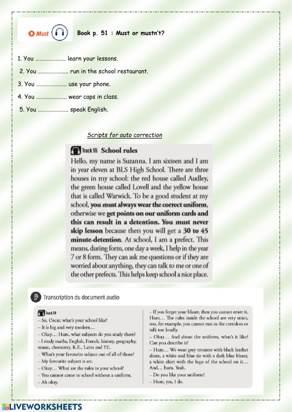 ID: 16935 Language: English School subject: English as a Second Language (ESL) Grade/level: lower intermediate Age: 9-13 Main content: Listening comprehension Other contents: must mustn't, Rules at school
